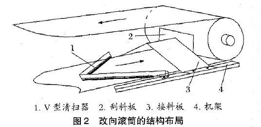 a) 在贴近改向滚筒表面部位加装刮料板,刮料板与接料板整体焊接在一起,接料板通过螺栓连接在输送机机架上,并且使刮料板与滚筒有一定倾斜角度,增加刮料能力。